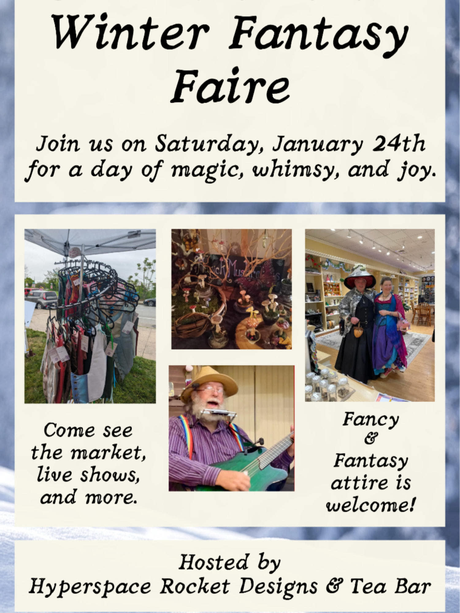 The 2026 Winter Fantasy Faire is almost upon us, bringing magic, whimsy, and fun to TownMall of Westminster. Join us on Saturday, January 24th to browse the market, go on quests, enjoy live music, and more! The Faire runs from 10:00am to 4:00pm on January 24th inside TownMall of Westminster. Costumes and garb are encouraged, but not required. Sponsored by Hyperspace Rocket Designs & Tea Bar.